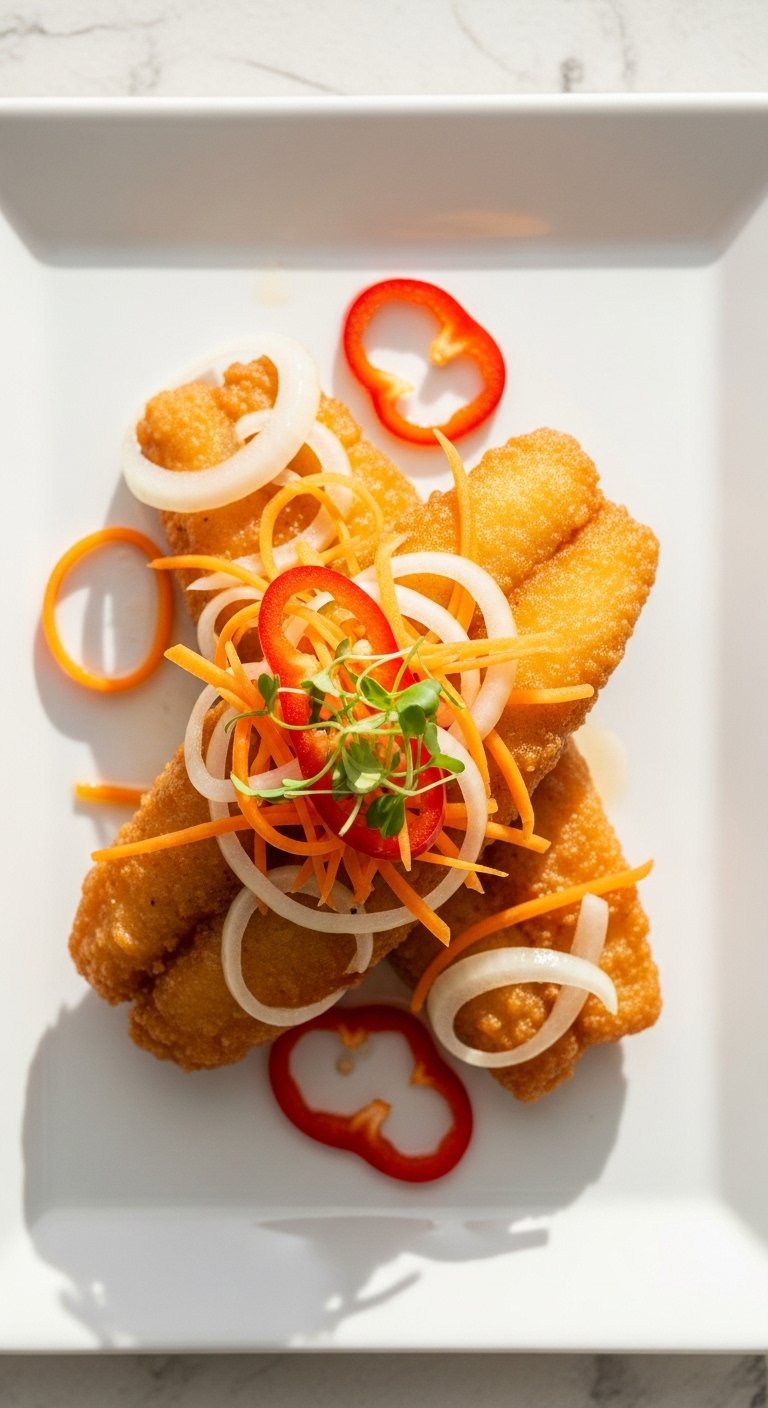 The Pour: Don’t just dump the vegetables on top. Carefully arrange the onion rings and carrot sticks across the length of the fish so the crispy skin is still visible underneath.