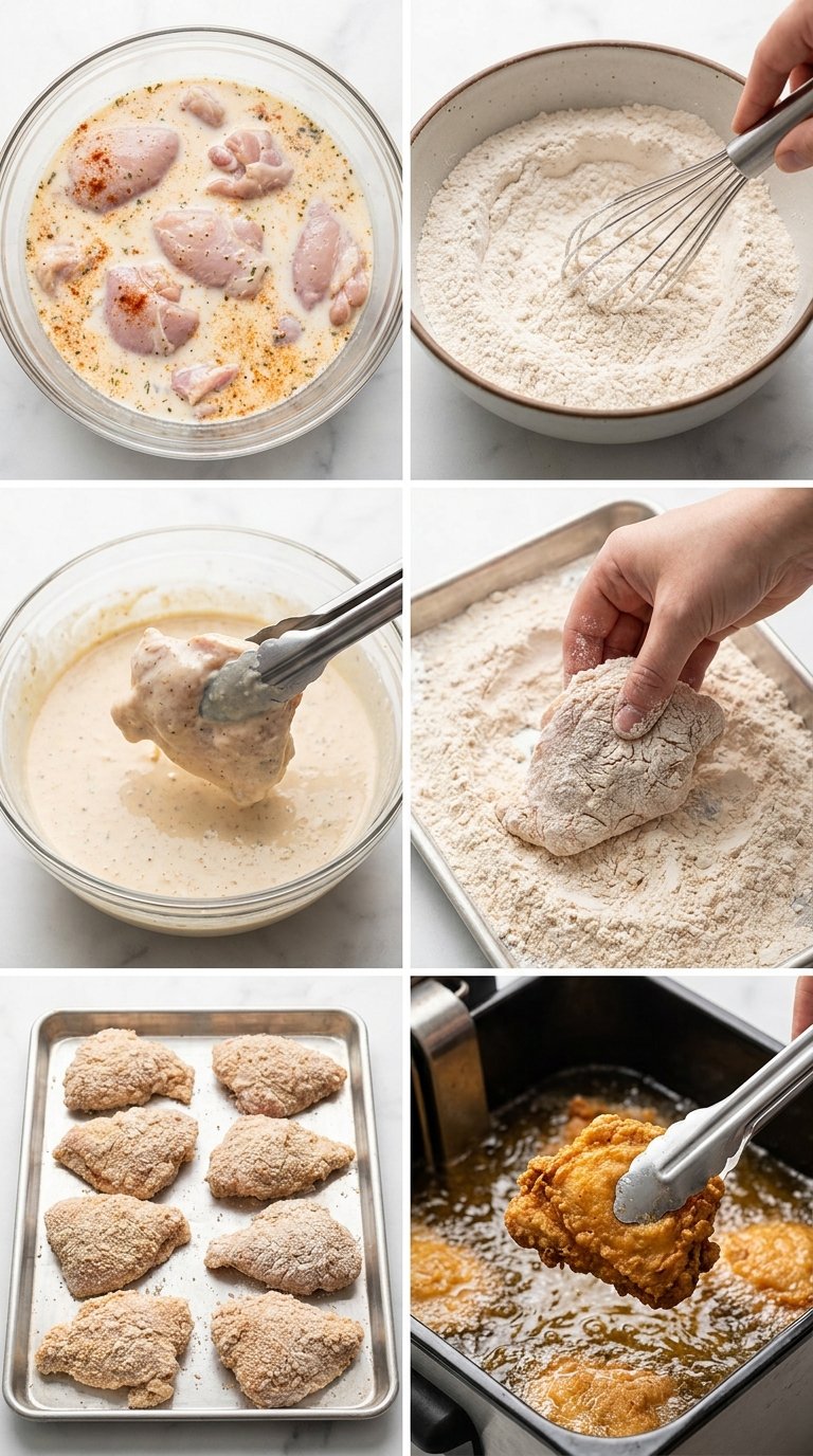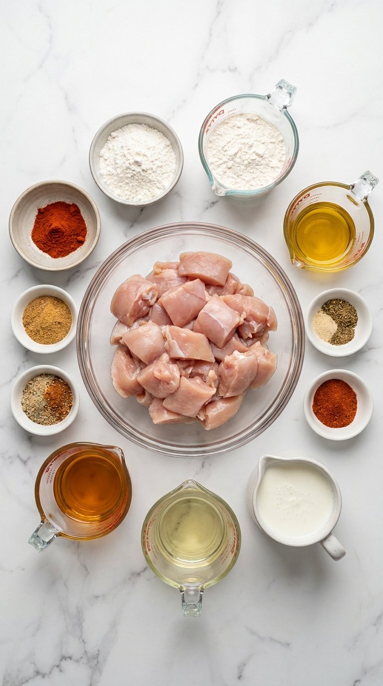 A successful recipe relies on gathering the highest quality components available. The foundation requires one whole chicken cut into eight individual pieces. You need one quart of rich cultured dairy liquid for the tenderizing bath. The dry station demands three cups of versatile all purpose flour alongside one cup of fine cornstarch. Chemical leavening requires exactly one tablespoon of fresh baking powder. The spice blend features two tablespoons each of kosher salt and coarse black pepper. Add one tablespoon each of smoked paprika and garlic powder. Procure two quarts of high quality peanut oil for the cooking process.
